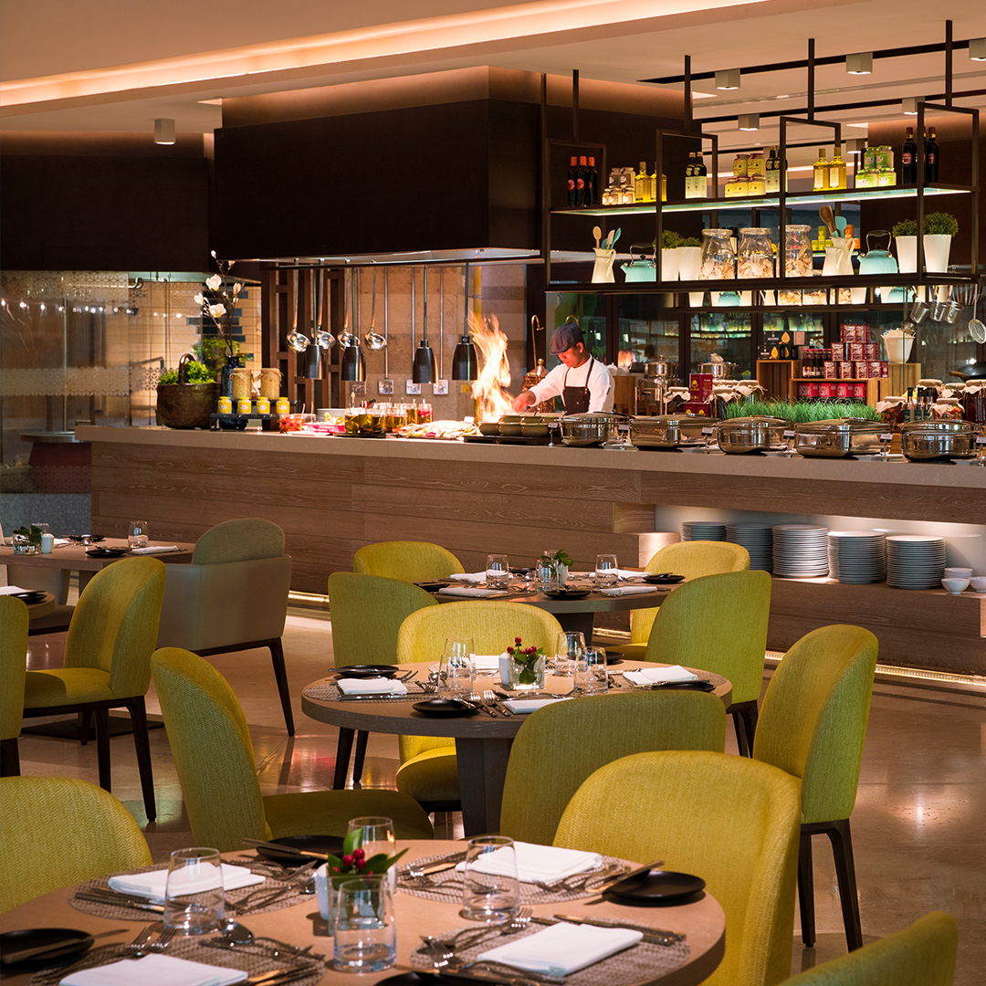 Oléa is a Mediterranean restaurant in St. Regis Saadiyat Island Resort. The restaurant is open the whole day, but expect a more casual dining experience in the daytime and fine dining in the evening. The atrium is impressive, with its high ceiling and floor-to-ceiling, tinted glass windows. The grand, winding staircase follows the ground floor’s flowing curves to the gallery, with a sinuously carved ceiling and waterfall countertops.